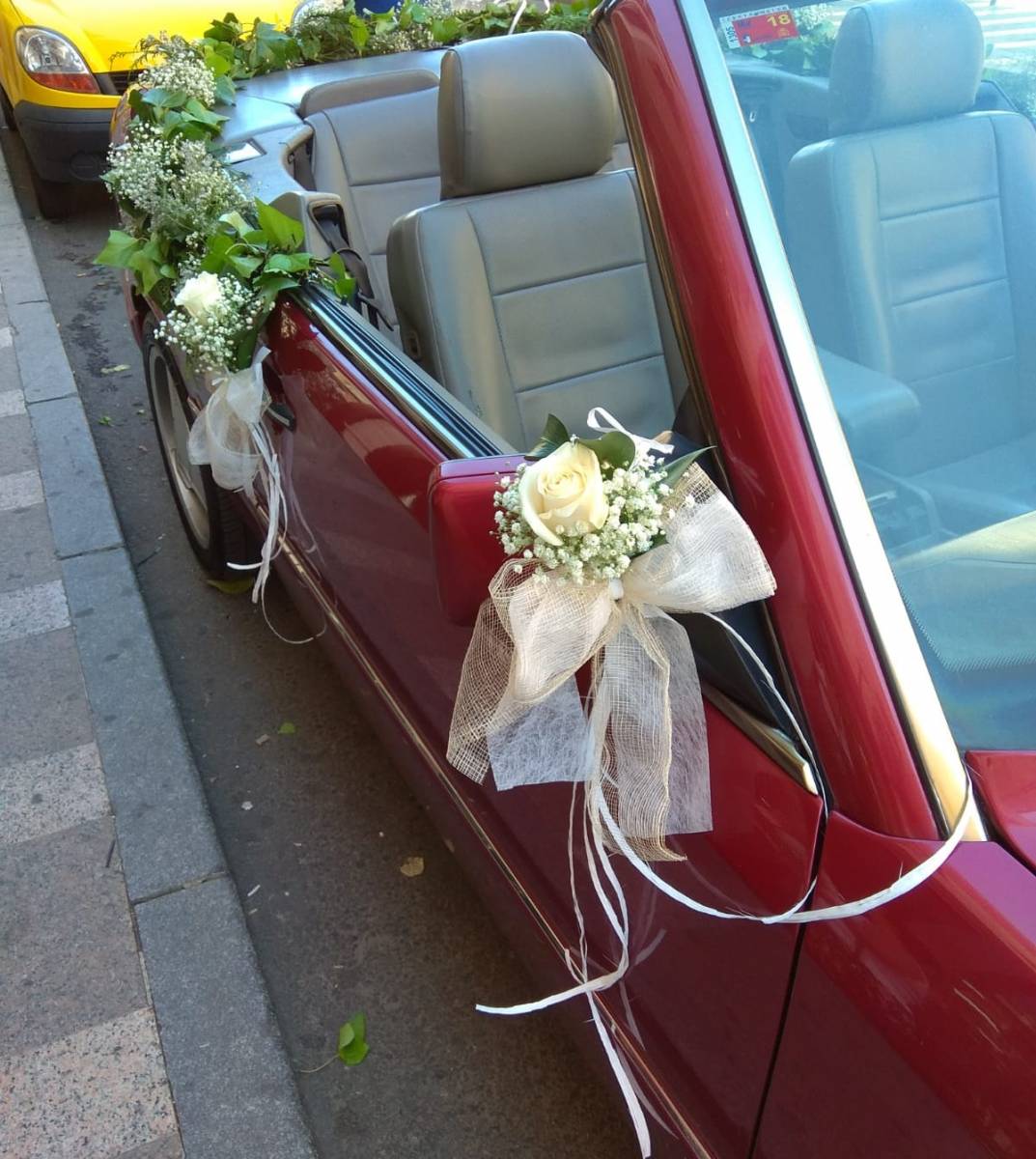 Arreglo coche con rosa blanca y paniculata combinado de guirnalda con flores y verdes.