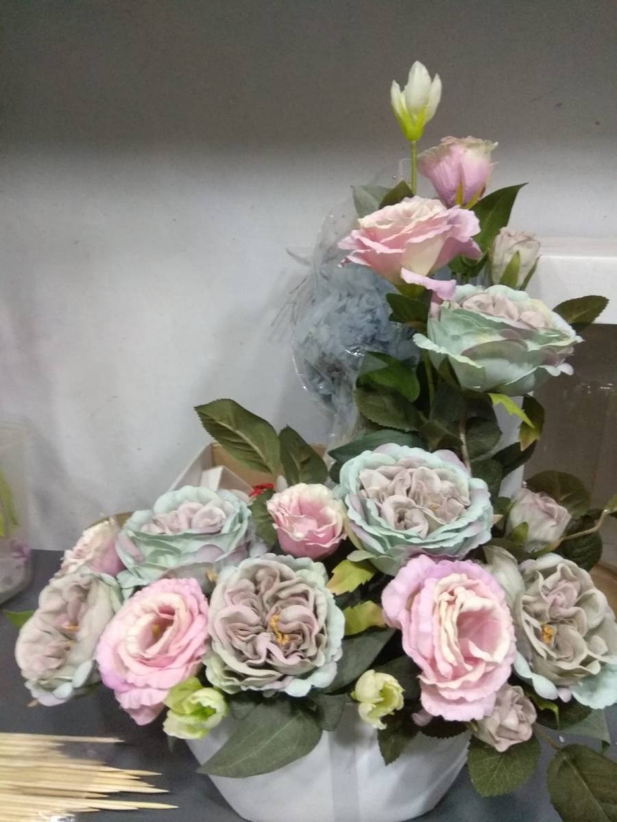 Jardinera artificial en forma de L, en tonos pastel combinado con tonos azules.