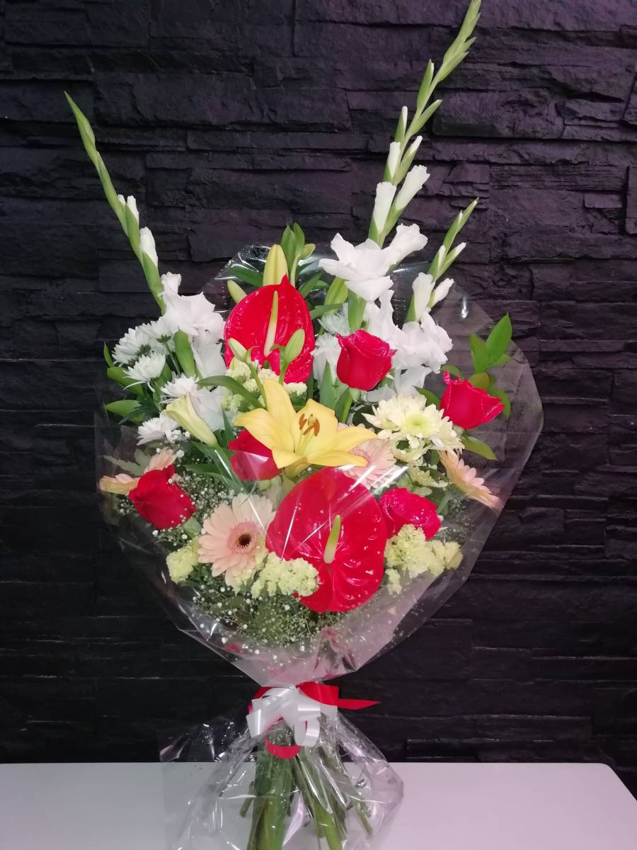 Ramo funerario colorido con variedad de flores.
