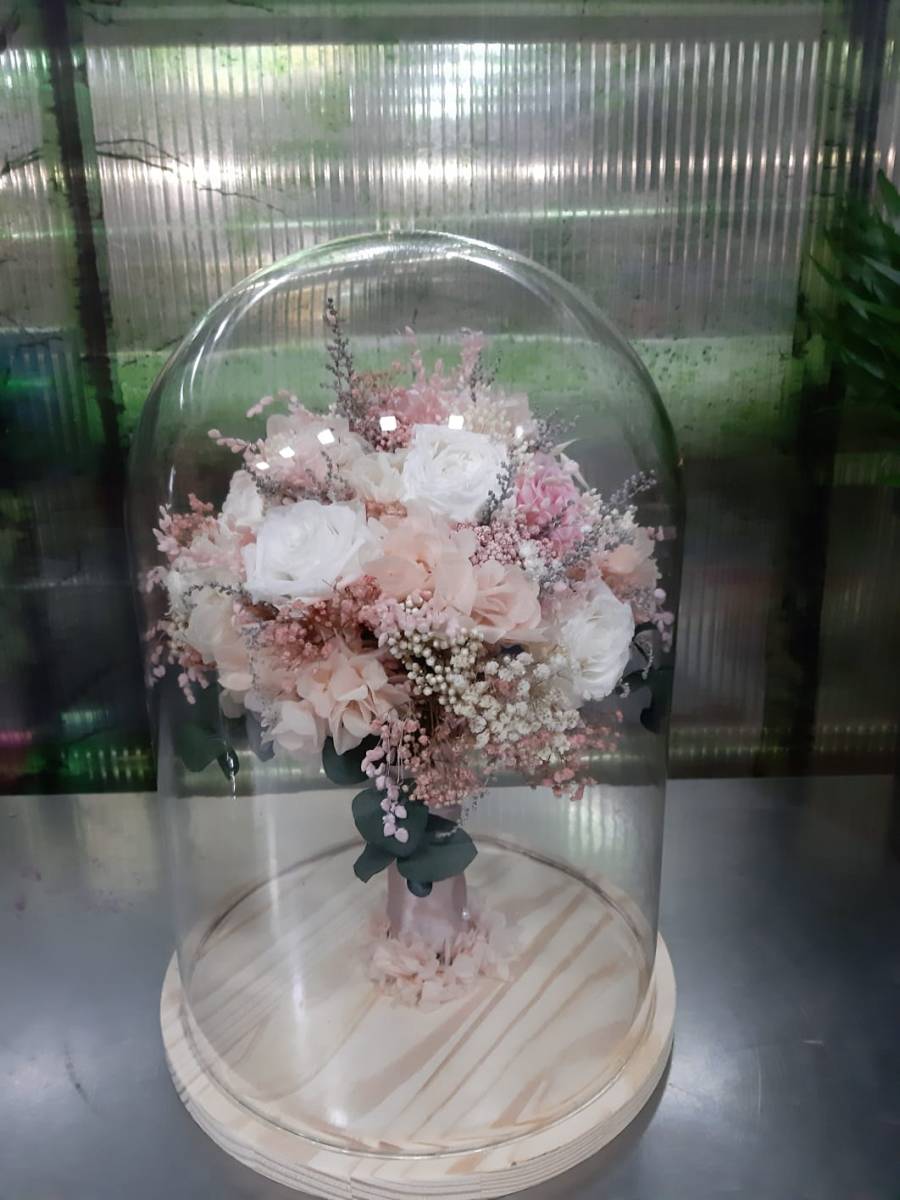 Ultima tendencia en ramos de novia. La flor era natural sometiéndose a un proceso de sustitución de la savia por otros productos como la silicona. Perfecto para mantenerlo durante años. Urna de cristal para guardarlo y decorativo recordando ese día tan importante.