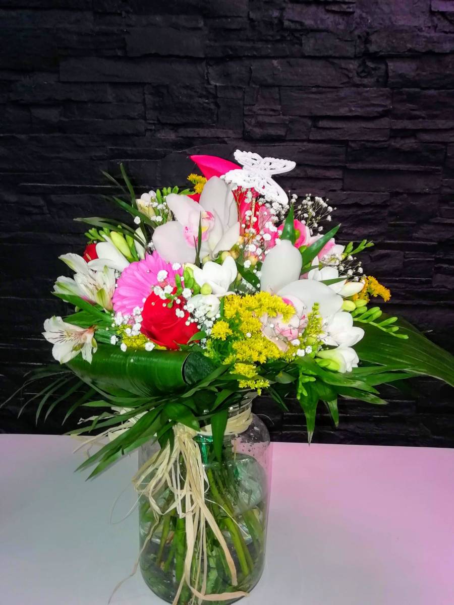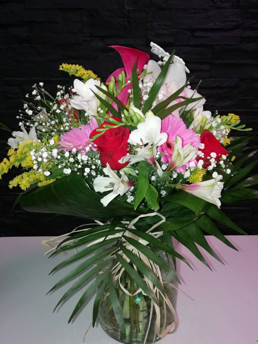 Ramo variado alegre y fino. Compuesto por rosas rojas, gerberas, calas y variados de verde.