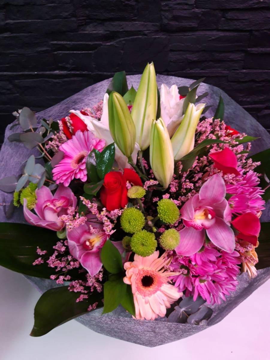 Ramo variado en tonos rosas, con lilium, gerberas, orquídeas y verdes. Un perfecto ramo para cualquier celebración.