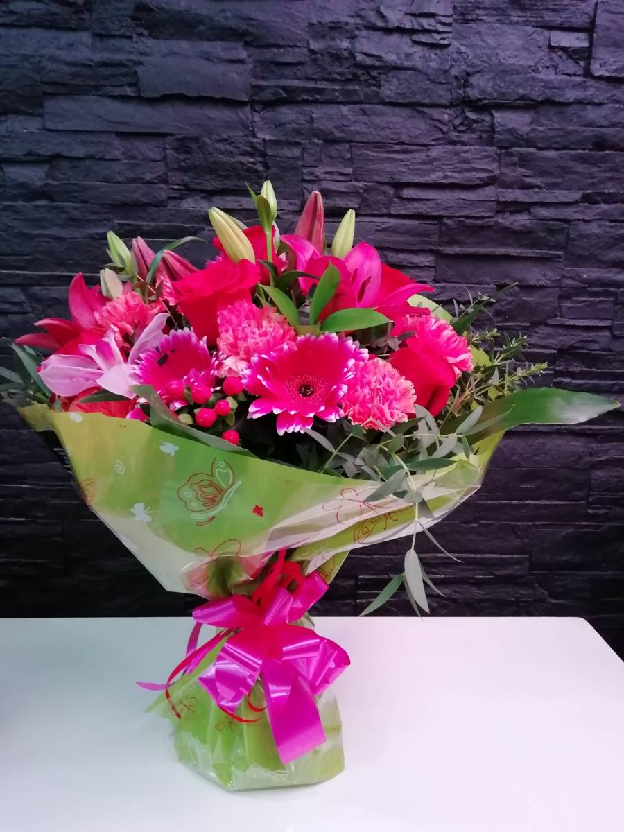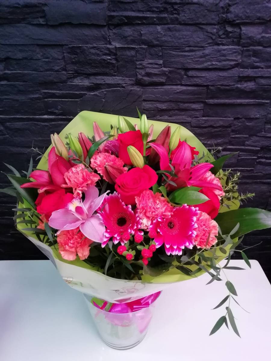Ramo variado con lilium, gervera, clavel, rosas rojas, hipericum y verdes.